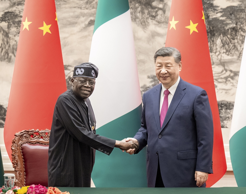 习近平指出,尼日利亚是具有重要影响的非洲大国,拥有巨大人口规模和发展潜力。建交半个多世纪以来,中尼始终相互尊重、平等相待,走出一条联合自强、合作共赢之路。近年来,两国在中非合作论坛框架内共同实施了一大批示范性、战略性合作项目。中国正在进一步全面深化改革、推进中国式现代化,这将为中尼关系发展带来更多机遇。双方要以高质量合作携手实现各自现代化,推动中尼关系实现新的更大发展。
