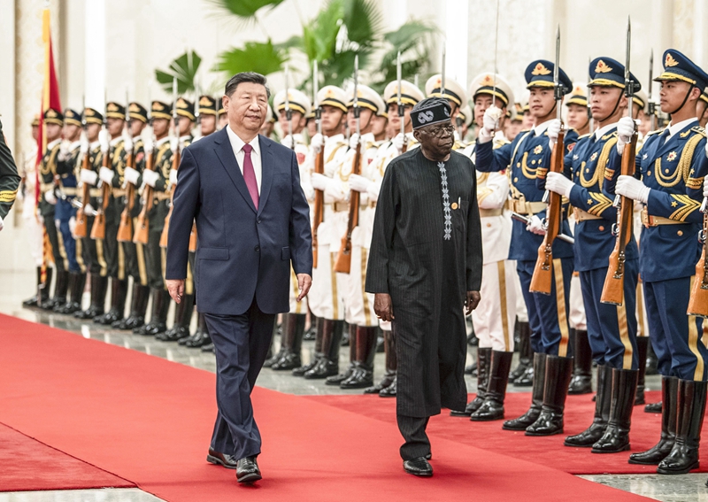 9月3日下午,国家主席习近平在北京人民大会堂同来华出席中非合作论坛北京峰会并进行国事访问的尼日利亚总统提努布举行会谈。这是会谈前,习近平在人民大会堂北大厅为提努布举行欢迎仪式。新华社记者 殷博古 摄