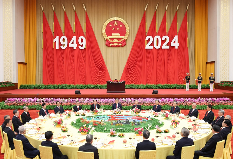 9月30日晚,庆祝中华人民共和国成立75周年招待会在北京人民大会堂隆重举行。习近平、李强、赵乐际、王沪宁、蔡奇、丁薛祥、李希、韩正等党和国家领导人与约3000名中外人士欢聚一堂,共庆新中国75周年华诞。新华社记者 黄敬文 摄