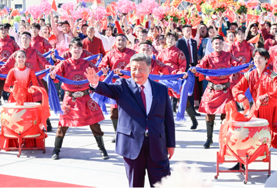 中共中央总书记、国家主席、中央军委主席习近平在乌鲁木齐出席新疆维吾尔自治区成立70周年庆祝活动后,9月25日中午乘专机返回北京。这是习近平在乌鲁木齐天山国际机场向前来欢送的各族群众挥手致意。新华社记者 申宏 摄
