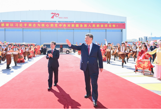 中共中央总书记、国家主席、中央军委主席习近平在乌鲁木齐出席新疆维吾尔自治区成立70周年庆祝活动后,9月25日中午乘专机返回北京。这是习近平在乌鲁木齐天山国际机场向前来欢送的各族群众挥手致意。新华社记者 谢环驰 摄
